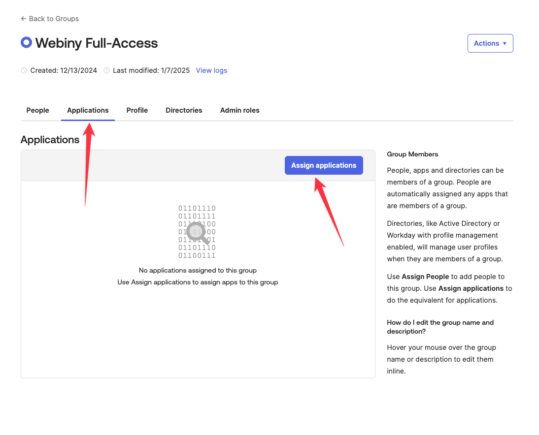 Once you have the app integration in place, you need to set up a connection between Okta users, and Webiny roles. In this example, we’ll be assigning users to Okta groups, and by doing that we want those users to automatically have certain application rights within Webiny.